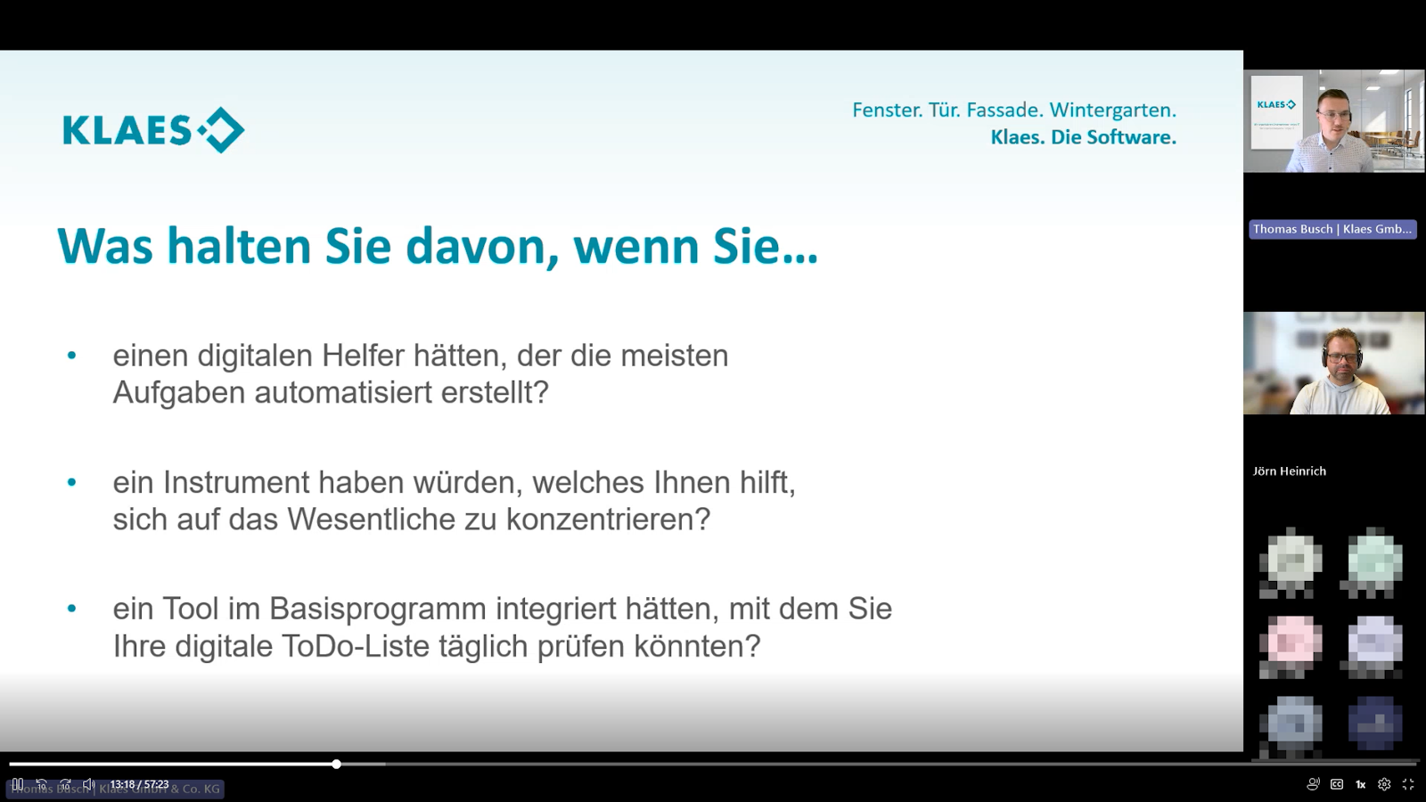 Wie können Fensterbauer ihre täglichen Abläufe digital und übersichtlich gestalten – ohne dass wichtige Informationen auf Zetteln verloren gehen? Genau darum ging es in der Web-Präsentation „Bestens organisiert mit dem Klaes Info Manager“, die von Thomas Busch aus der Klaes-Anwendungstechnik moderiert wurde. Praxispartner war Jörn Heinrich, Geschäftsführer der Heinrich GmbH & Co. KG aus Wetzlar, der das Tool bereits erfolgreich im Einsatz hat.