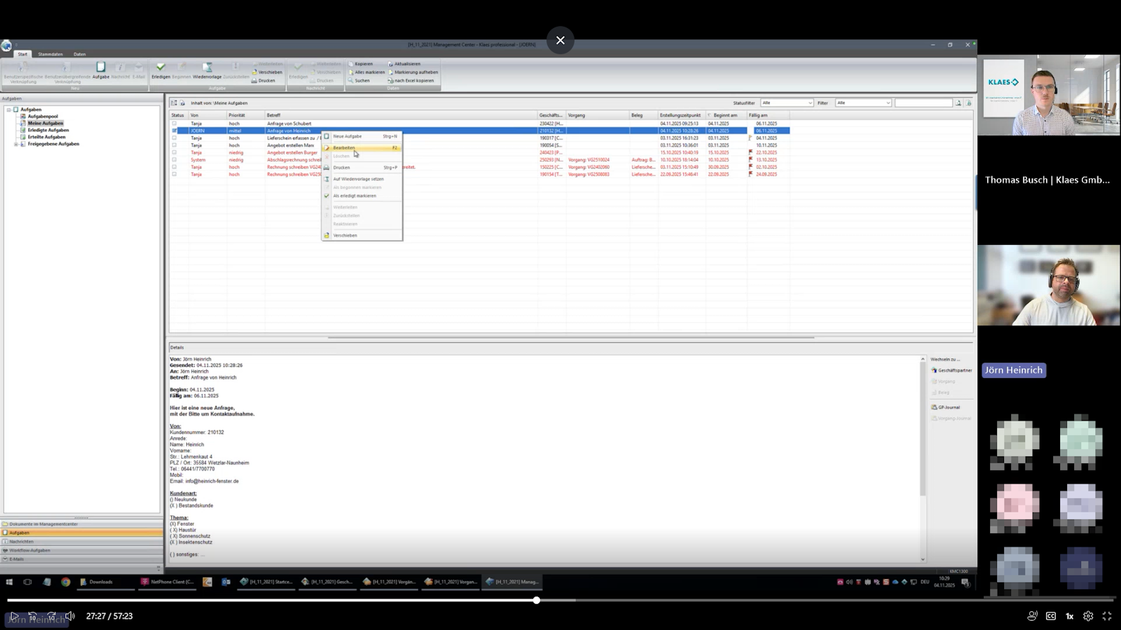 Jörn Heinrich zeigte anschließend live, wie der Klaes Info Manager im Alltag genutzt wird. „Bei uns startet der Prozess schon beim ersten Kundenkontakt“, erklärte er. „Sobald ein Kunde anruft, wird automatisch eine Aufgabe im System erstellt – komplett mit Kundendaten und Priorität. So bleibt nichts liegen.“
