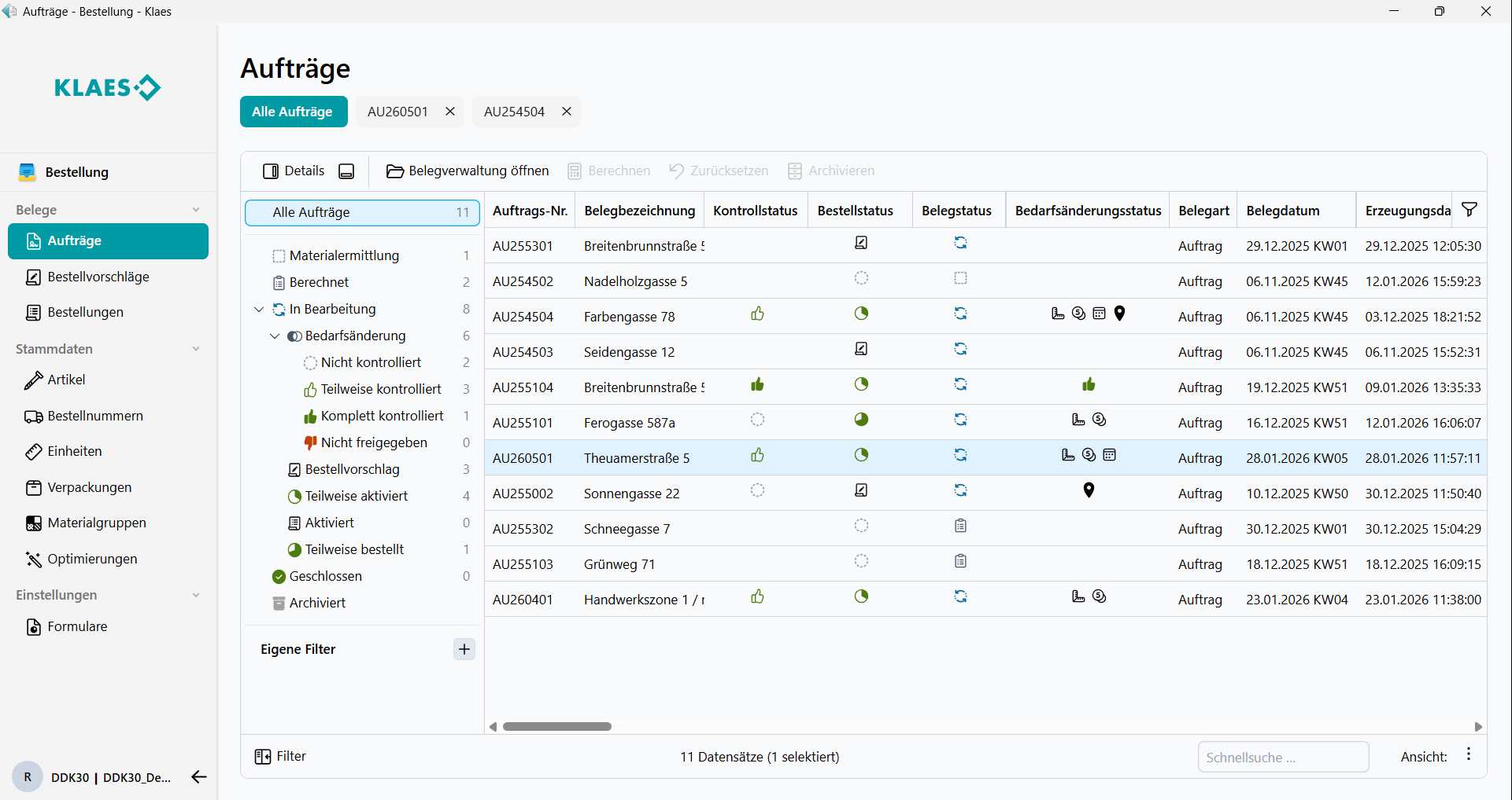 Im Bereich Klaes Einkauf zeigt Klaes zahlreiche Weiterent-wicklungen. Eine moderne Oberfläche, die zentrale Verwaltung von Stammdaten und Lieferanten sowie flexible Auswertungen bilden die Grundlage. Neu ist unter anderem die automatische Erkennung von Bedarfsänderungen, die nachträgliche Anpassungen transparent sichtbar und gezielt prüfbar macht.