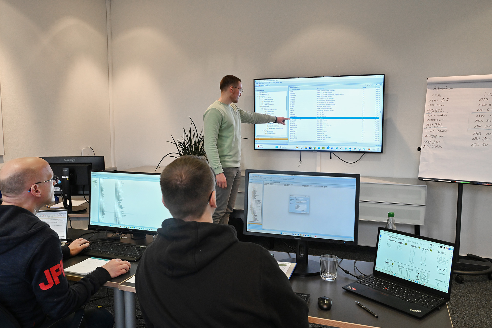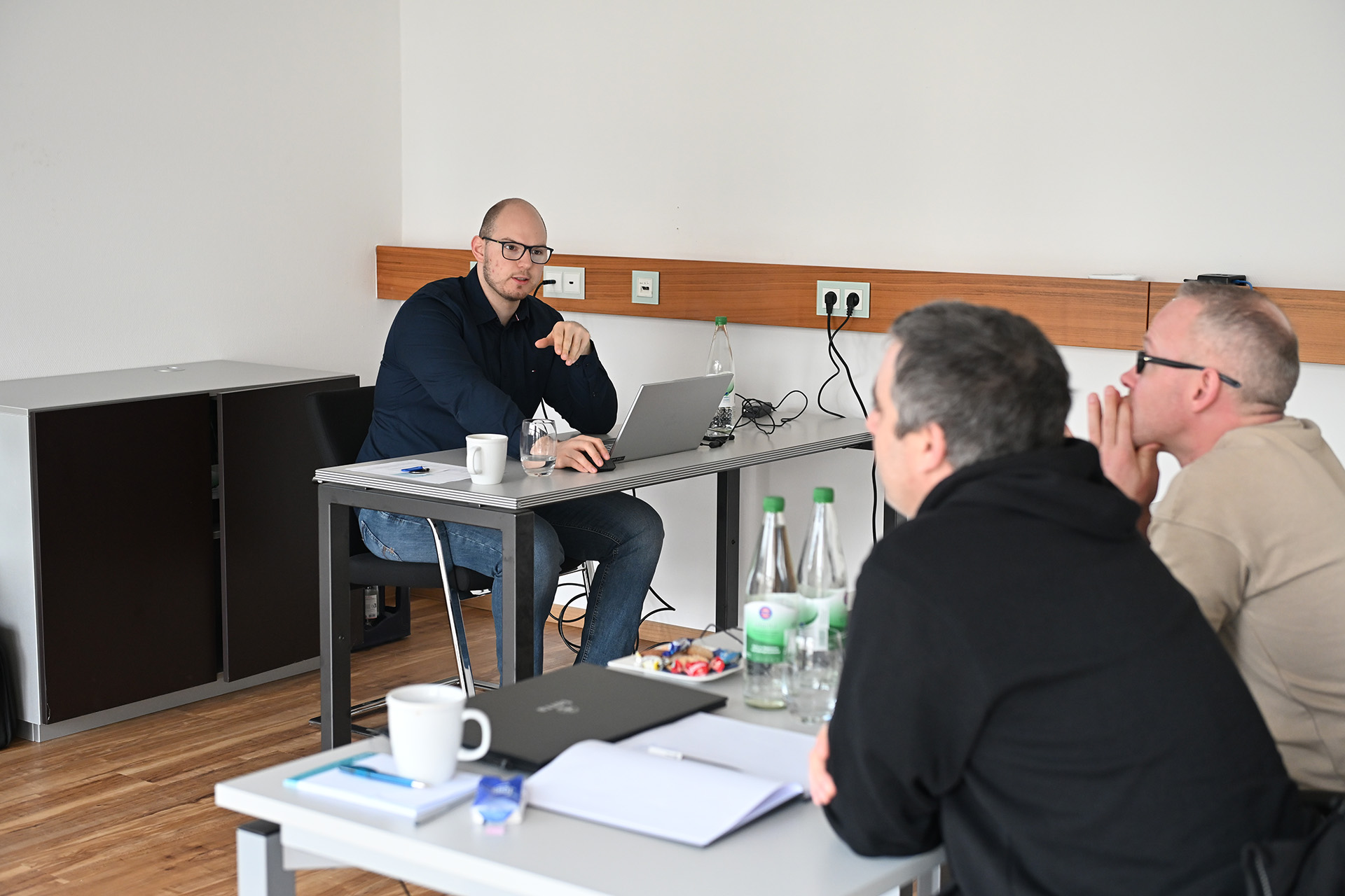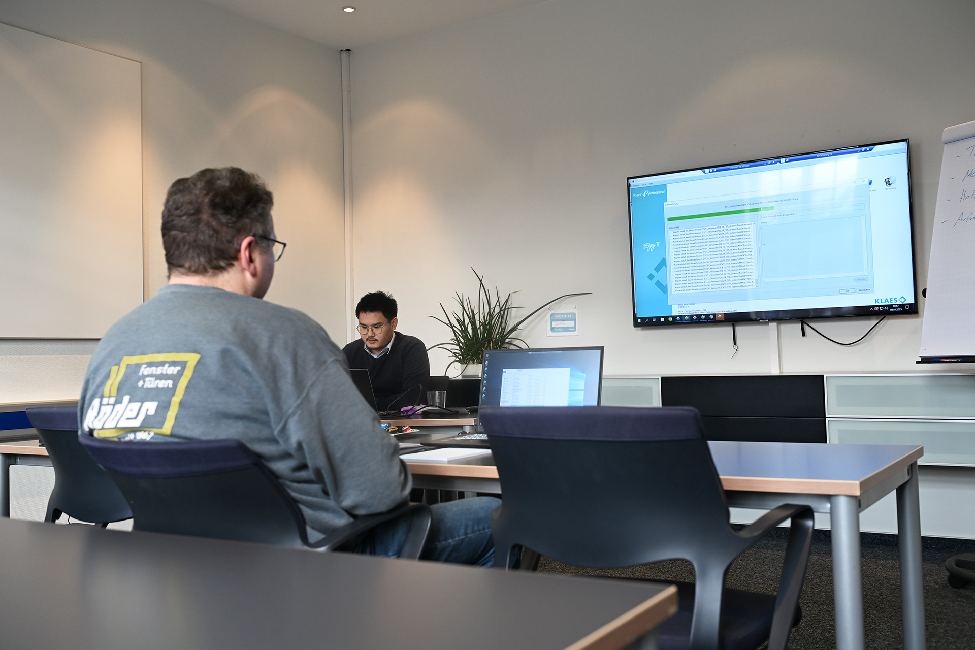 Neben Geschäftsführer Dirk Fischbach nahm auch Noah Fischbach an dem Termin teil. Für ihn war es die erste Gelegenheit, einen Einblick in die Klaes-Software zu erhalten und sich mit den Möglichkeiten der digitalen Fensterfertigung vertraut zu machen.